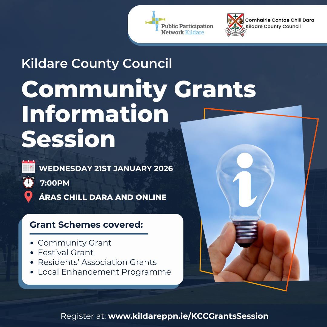 Kildare County Council’s Community Grants Schemes will open on Monday, 19 January 2026. To support groups preparing applications, Kildare PPN and the Community Section of Kildare County Council will host a Community Grants Information Evening on Wednesday, 21 January 2026 at 7 p.m. The session will take place in Áras Chill Dara, Naas, with an option to join online.