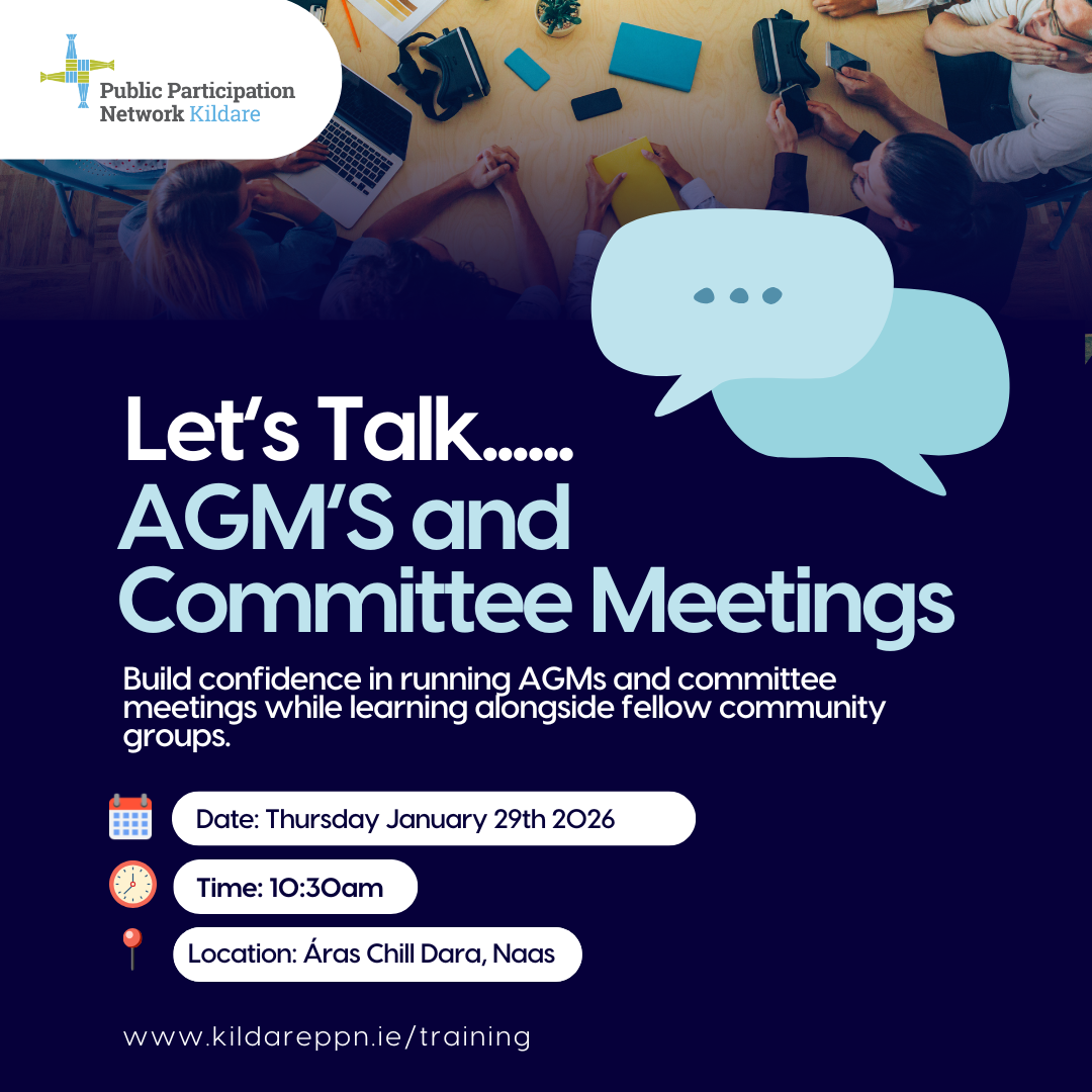 We’d like to draw your attention to two upcoming events this month: an information session on the Kildare County Council Community Grants taking place on Wednesday the 21st of January, and a training session on running AGMs and committee meetings, designed to build confidence and provide an opportunity to learn alongside other community groups on Thursday the 29th of January in Naas.