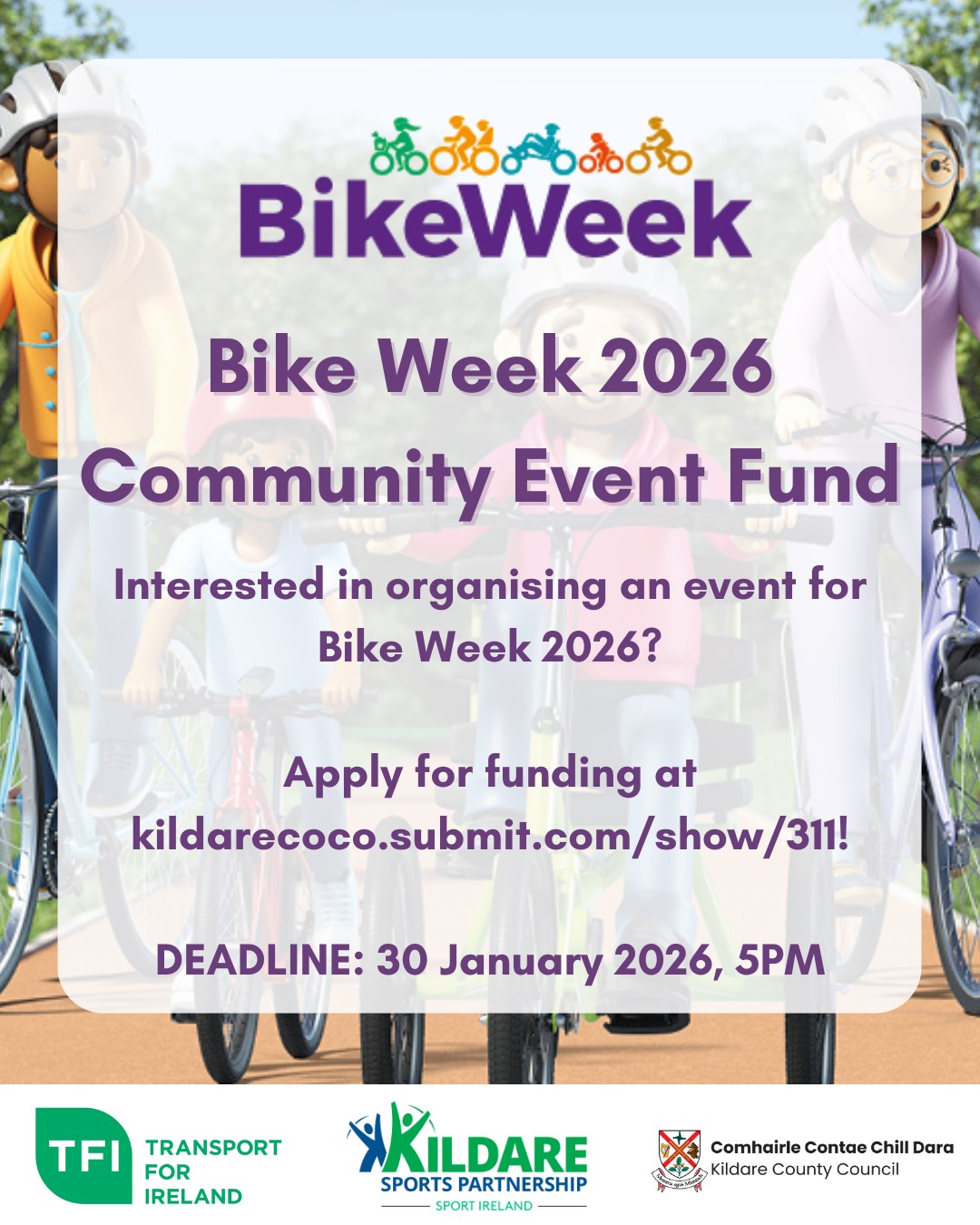Kildare County Council and Kildare Sports Partnership, supported by the National Transport Authority would like to offer community groups the opportunity to organise their very own Bike Week 2026 event, which will run from May 9th to May 17th. We believe this is a great opportunity to get as many people out on two wheels as possible.