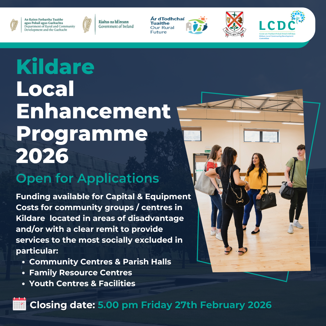 Kildare LCDC has been allocated €246,667.65 to support Capital and Equipment Costs incurred by community groups/organisations in Kildare. The priority of Kildare LEP is to aid Community Groups/Organisations and Centres located in areas of disadvantage and/or with a clear remit to provide services to the most socially excluded in particular: