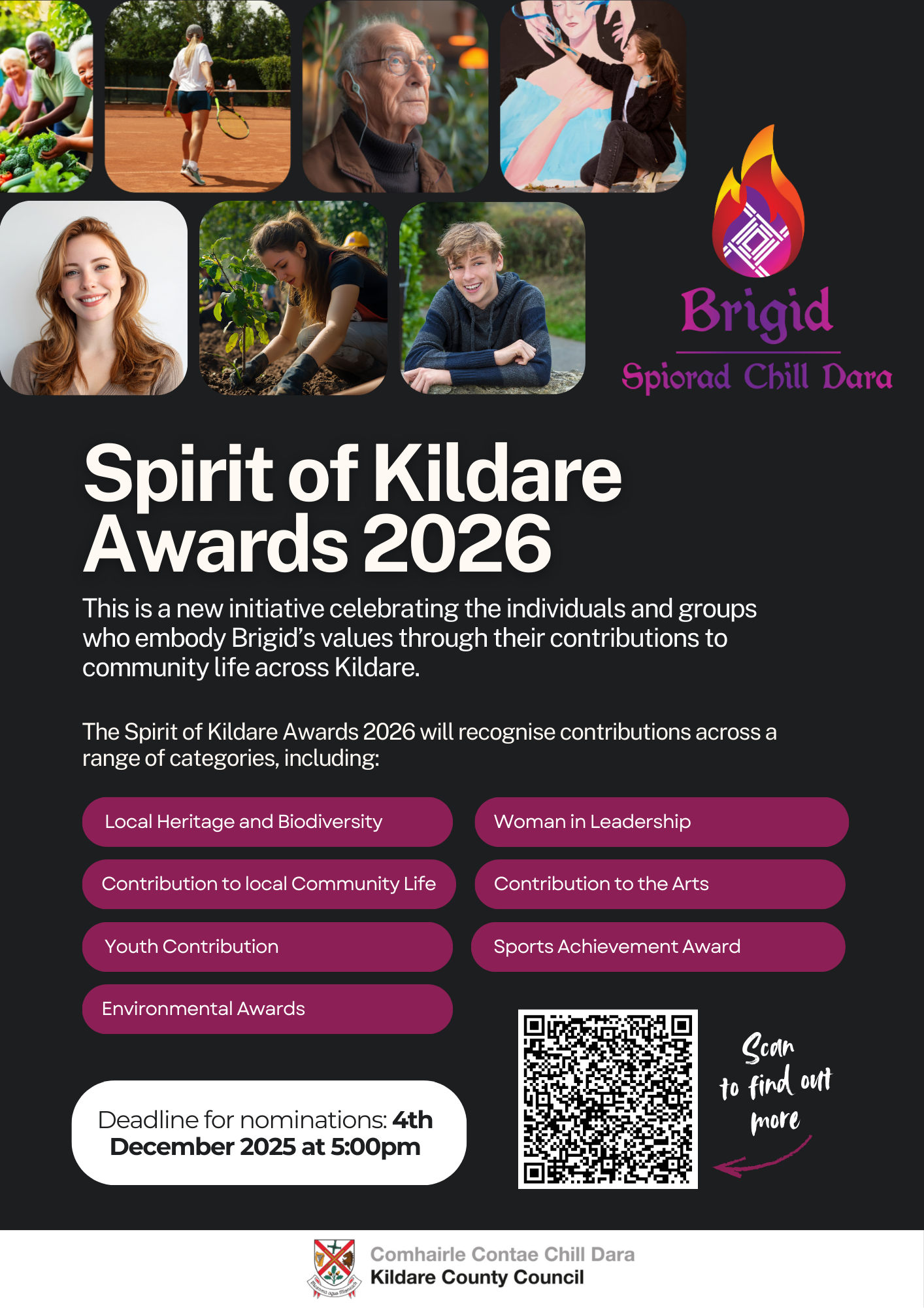 These awards will celebrate the incredible individuals and groups across Kildare who bring Brigid’s values to life, through creativity, compassion, community, and commitment. Award categories include: